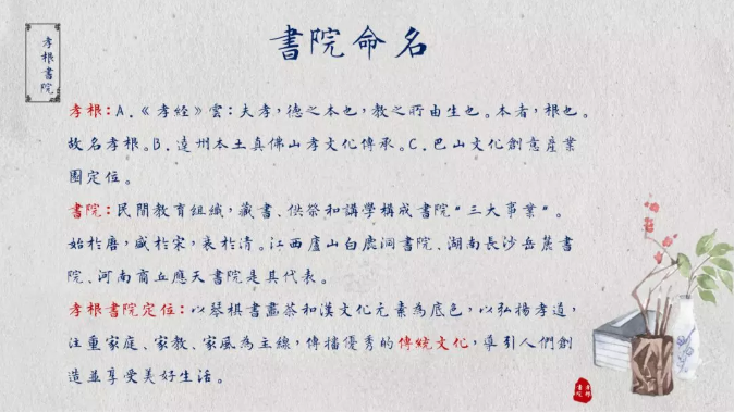 ? ?【孝根書院】以琴、棋、書、畫、茶和漢文化元素為底色,以弘揚(yáng)孝道,注重家庭、家教、家風(fēng)為主線,傳播優(yōu)秀的傳統(tǒng)文化,導(dǎo)引人們創(chuàng)造并享受美好生活。?